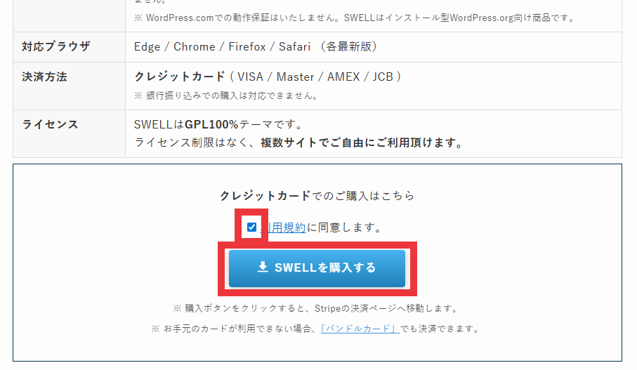 利用規約を確認し、OKならチェックボックスにチェックを入れ、「SWELLを購入する」をクリックします。
