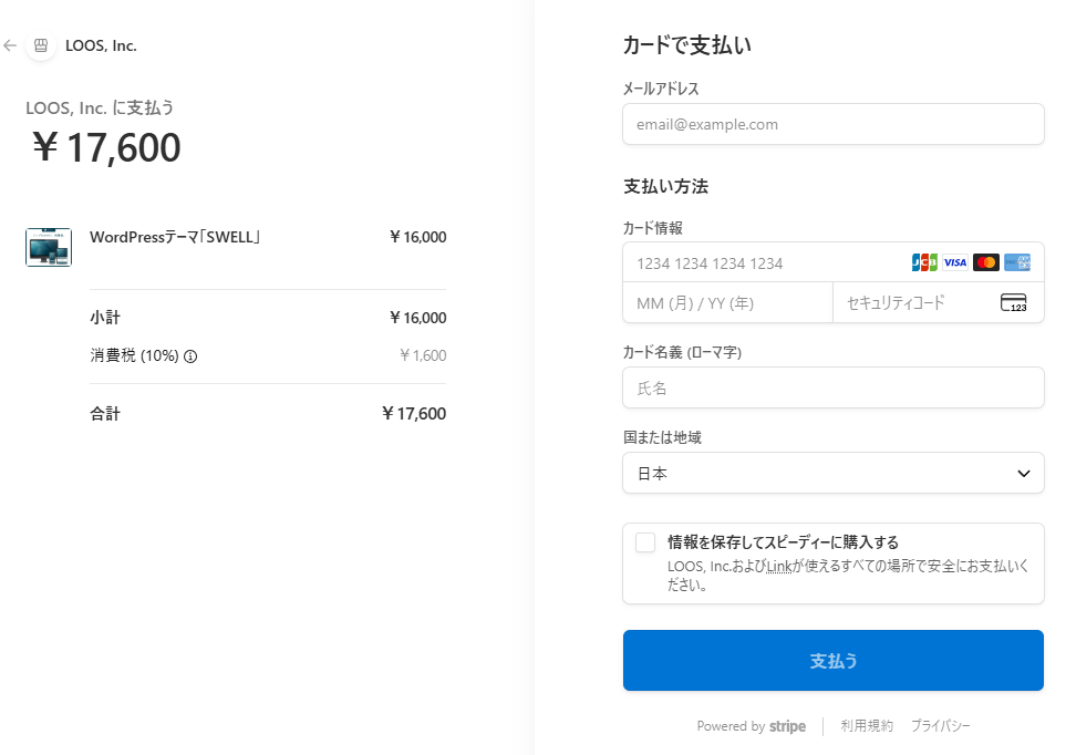 すると、決済の画面に遷移するので、カード情報を入れて購入手続きをしてください。
