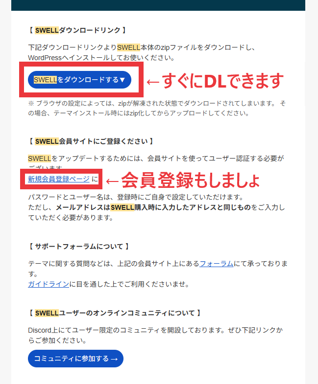 - 「SWELLをダウンロードする」からするにダウンロードできます。(ZIPファイルがダウンロードされます。)