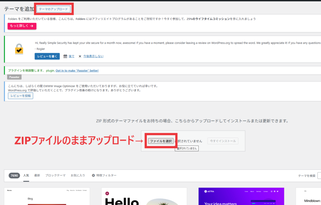 SWELLはWordPressの管理画面から見れる「公式ディレクトリ」からはインストールできないため、公式サイトからZIPファイルを手に入れて、手動でWordPressにアップロードする必要があります。