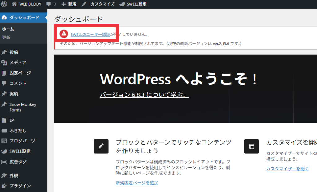 ユーザー認証が済んでいないと、WordPressのダッシュボードに「SWELLのユーザー認証が完了していません。」と表示されます。