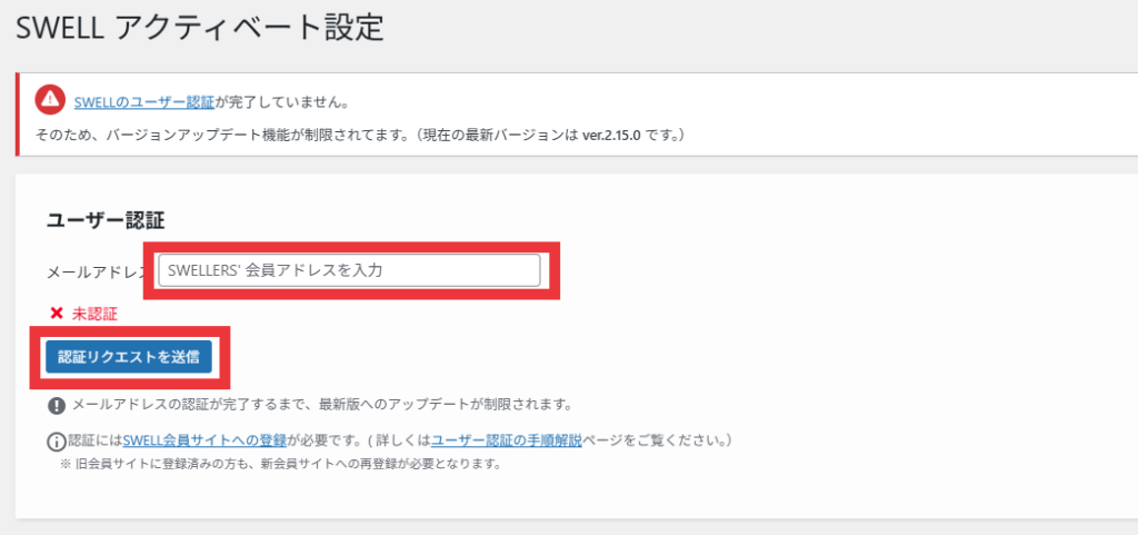 それをクリックすると、SWELLの会員登録をしたメールアドレスを入れる欄が出てきますので、メールアドレスを入力して、「認証リクエストを送信」を押してください。